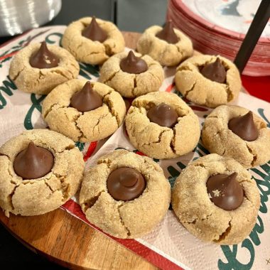 - Mini peanut butter cups can be used instead of kisses, but cookies will spread slightly more