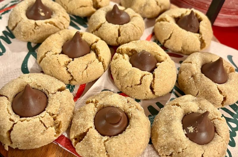 - Mini peanut butter cups can be used instead of kisses, but cookies will spread slightly more